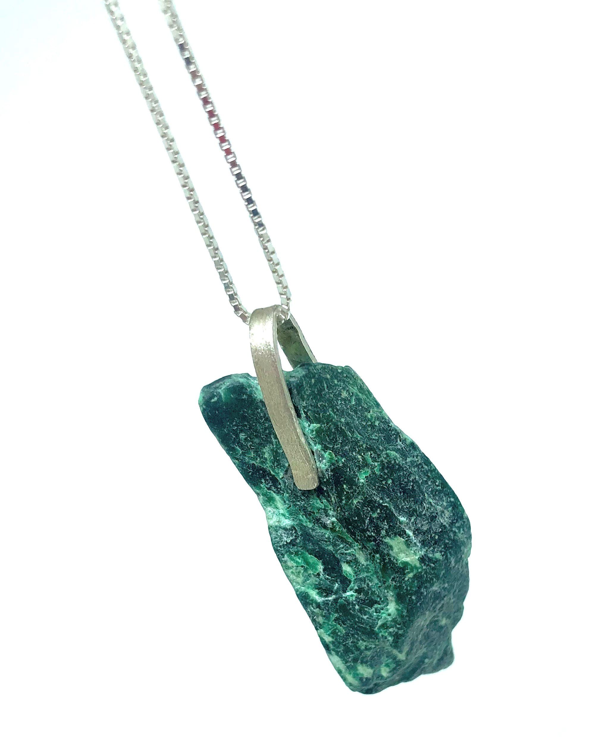 Colar exclusivo em prata com corrente 70cm veneziana e pedra natural quartzo verde bruto, detalhe texturizado artesanalmente.